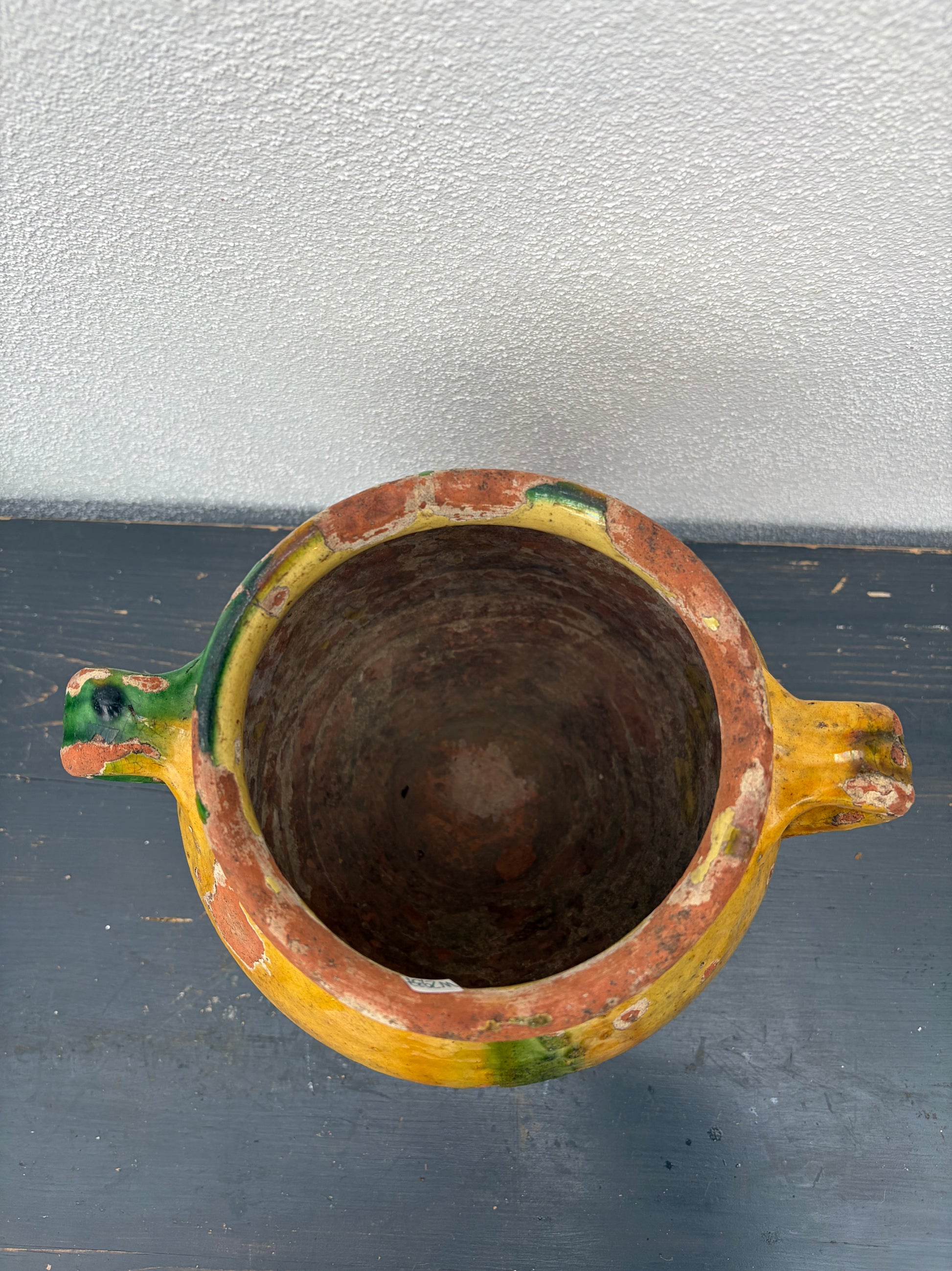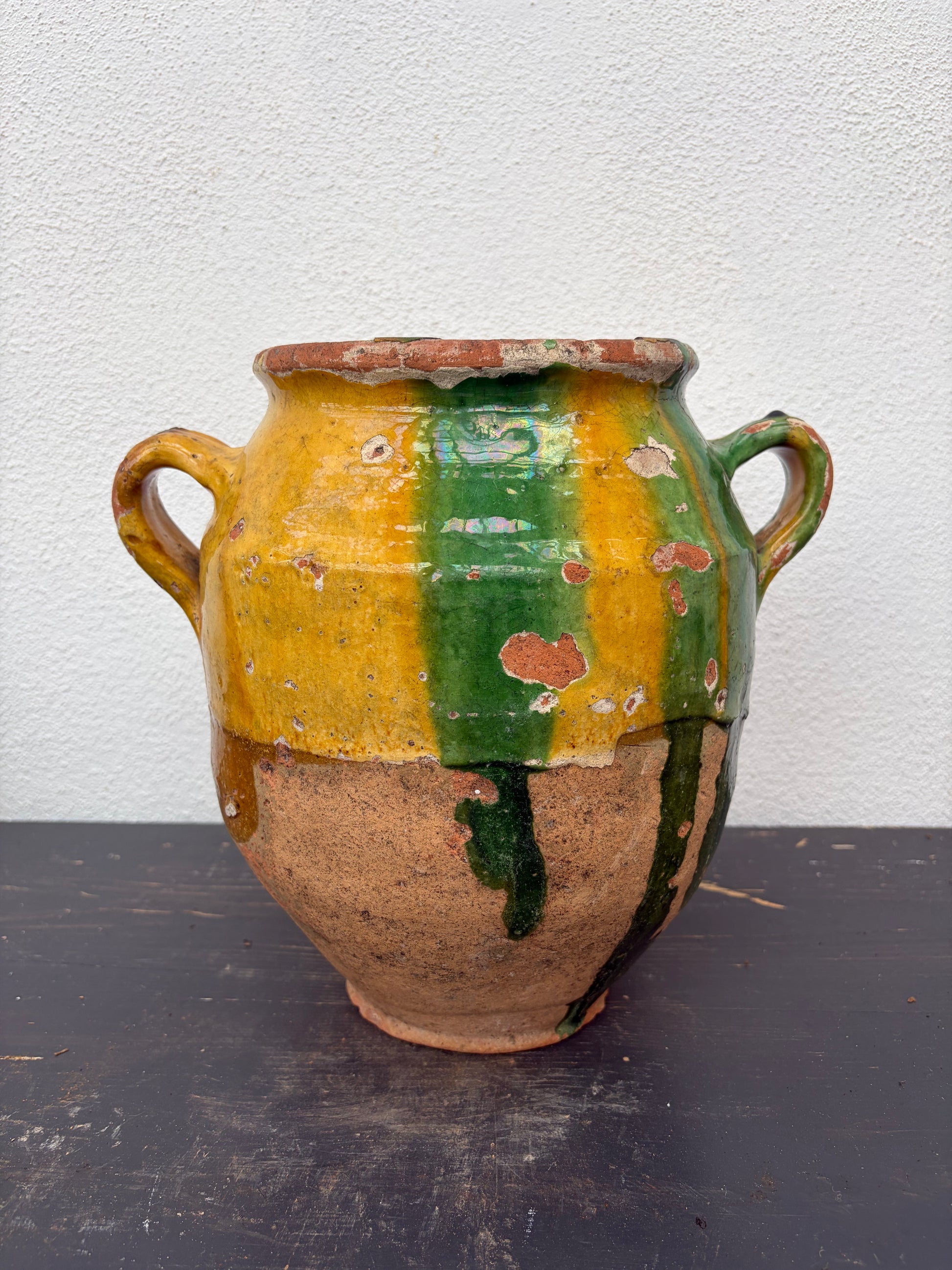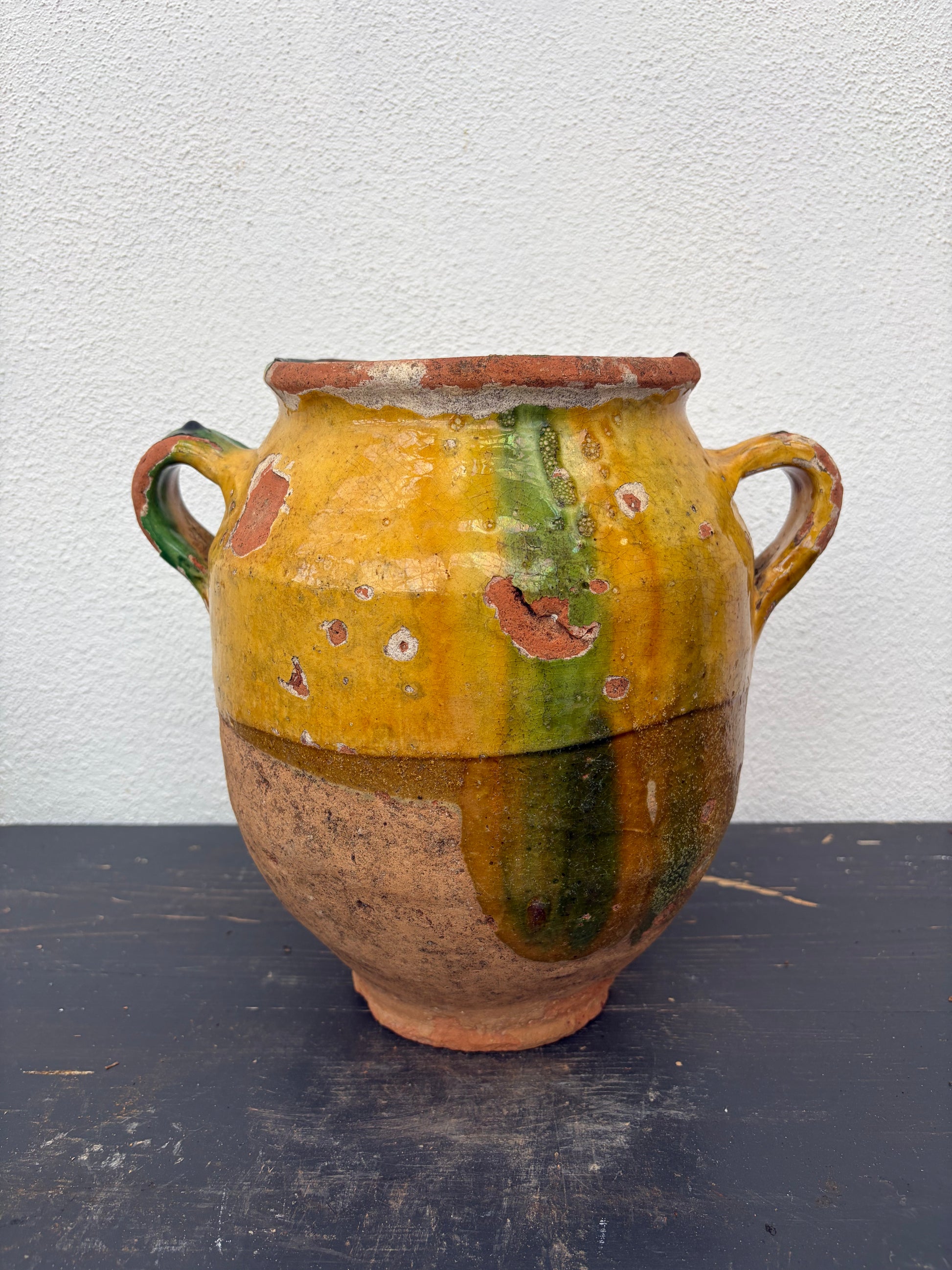 Flot confitkrukke med gul og grøn glasur.