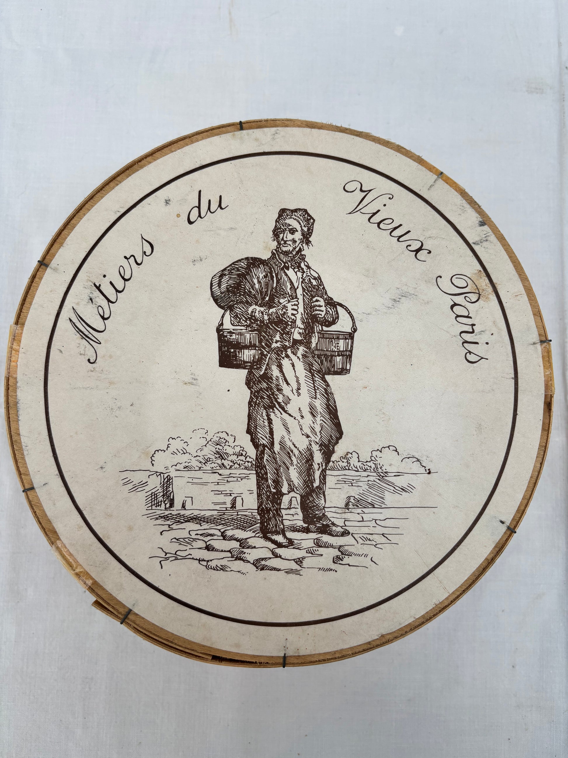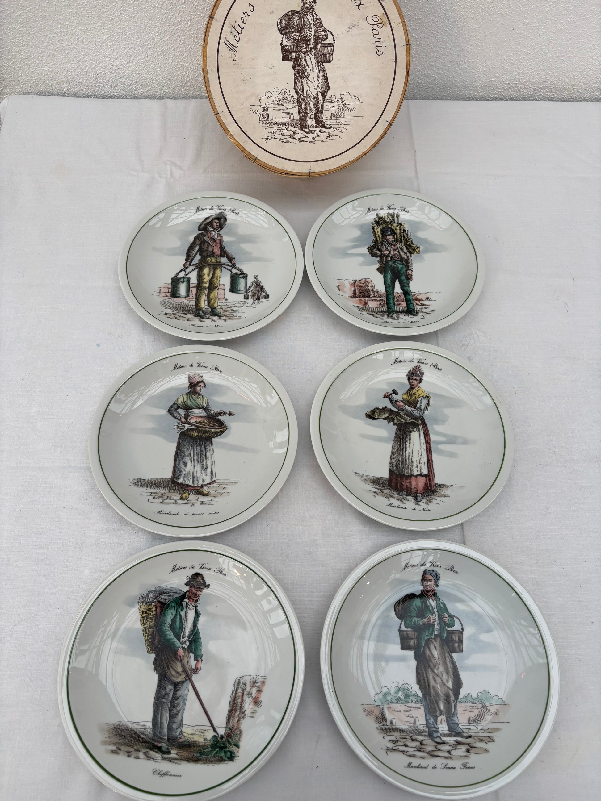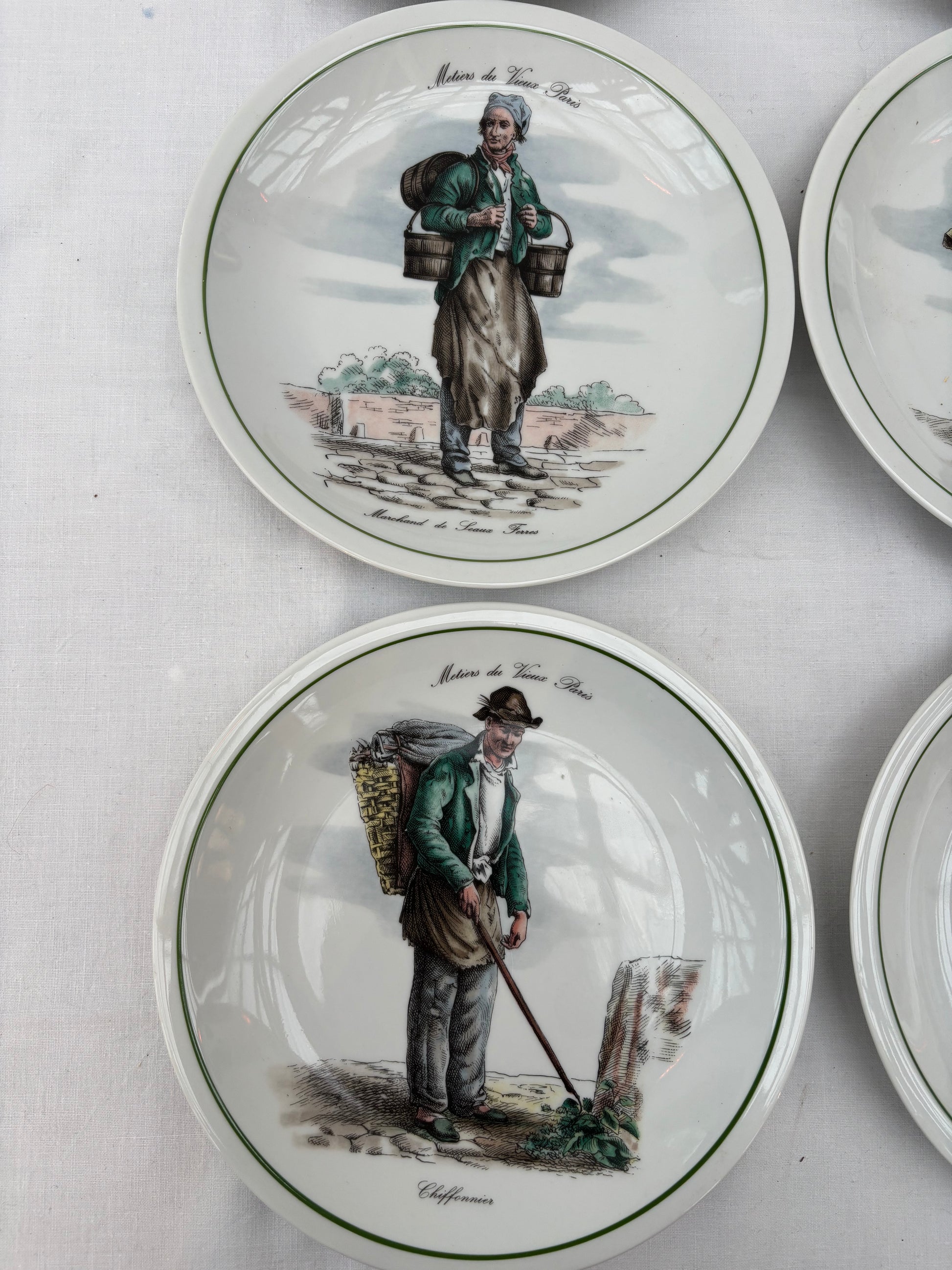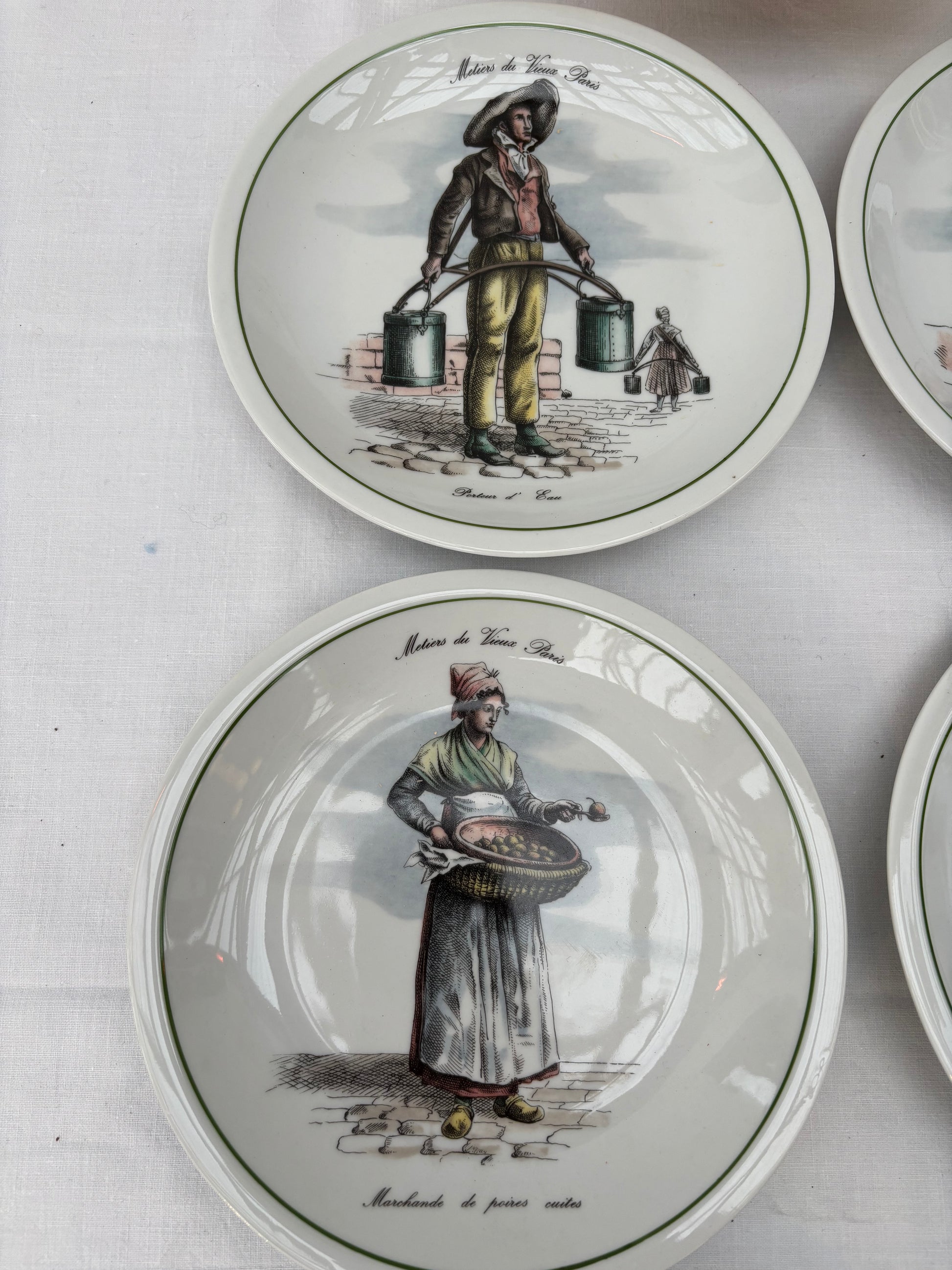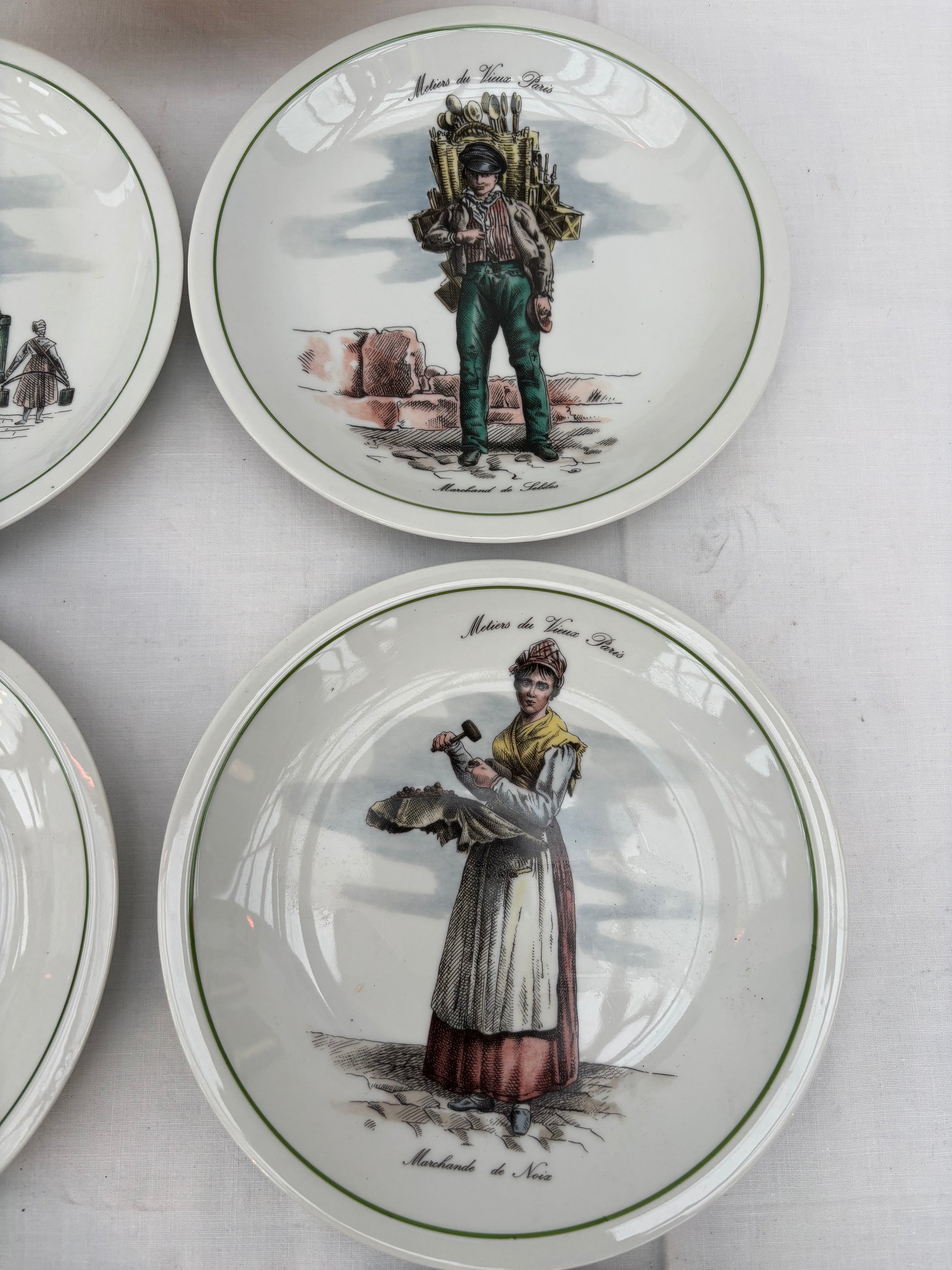 Plates with pictorial motifs of old professions in Paris.