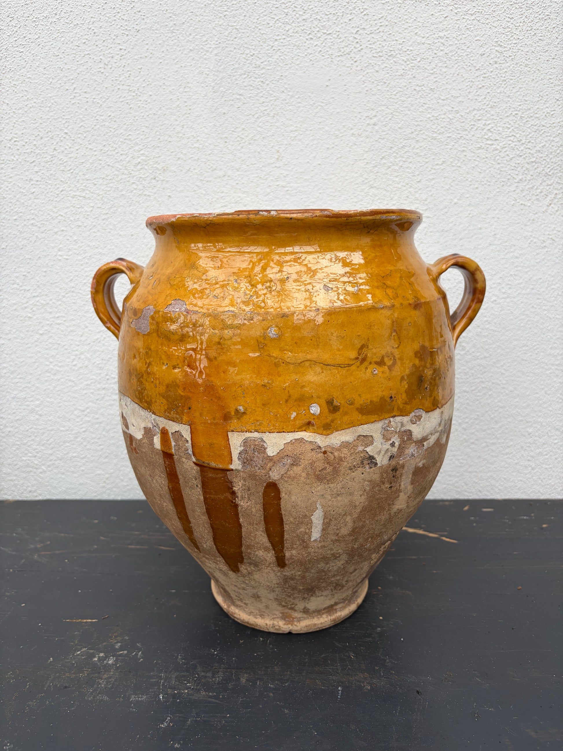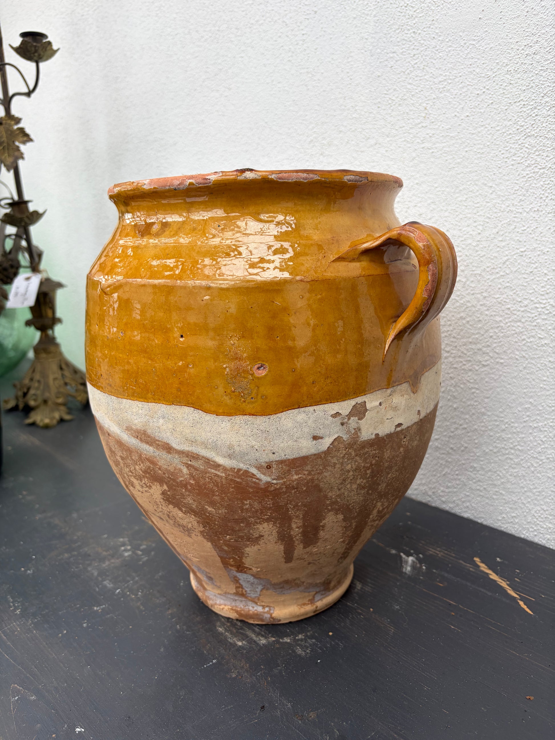 Flot stor confitkrukke med gul glasur.
