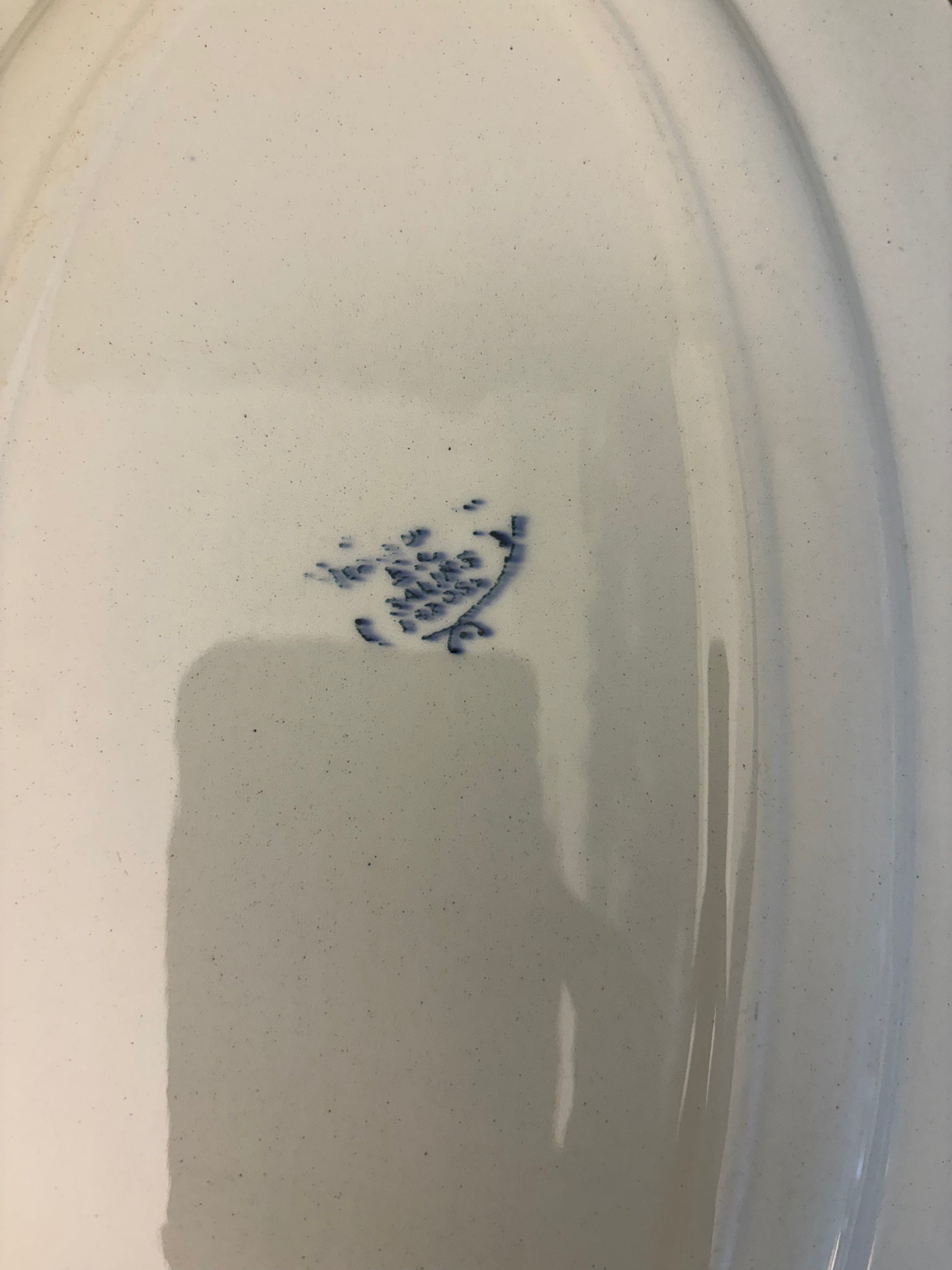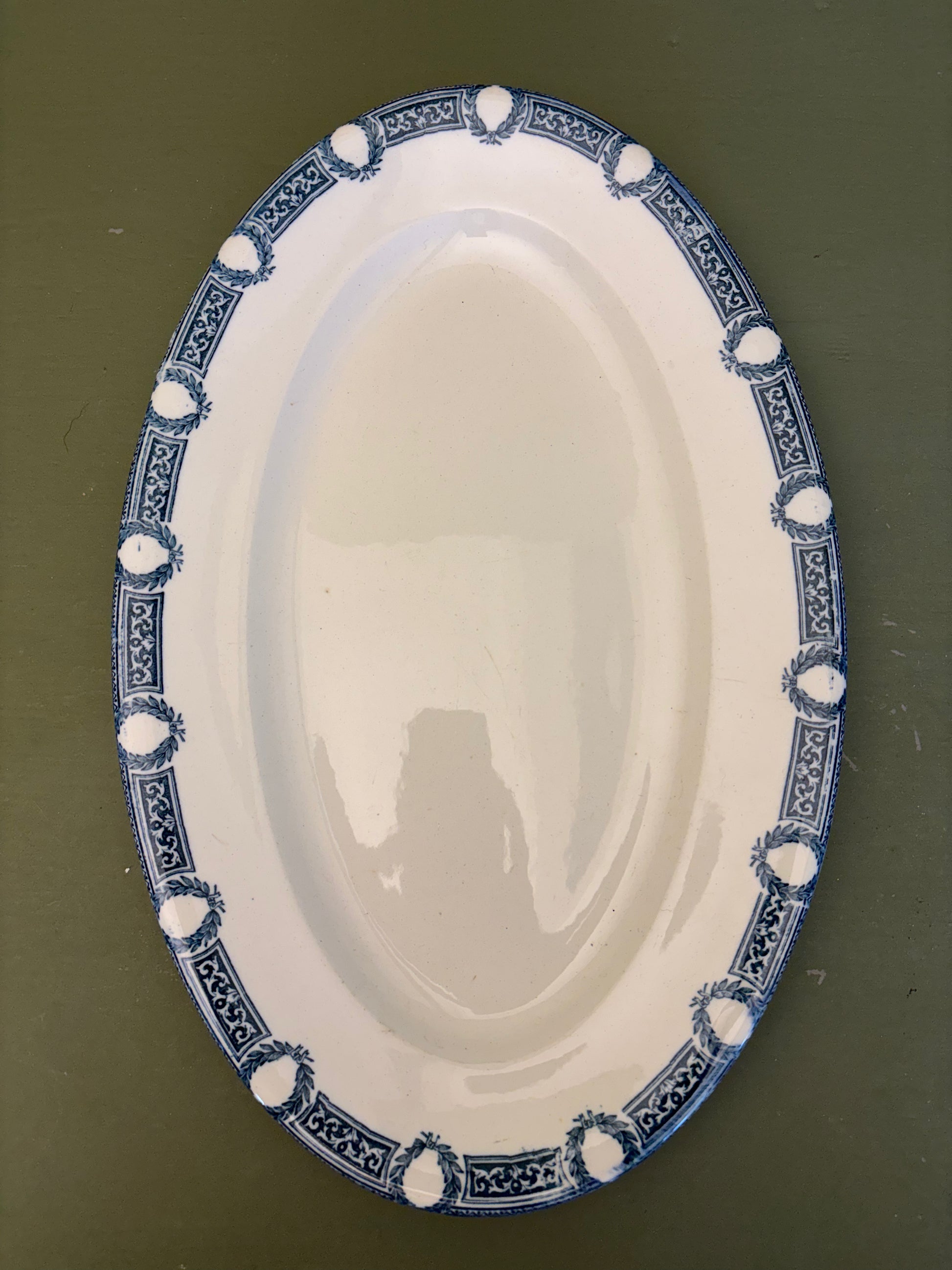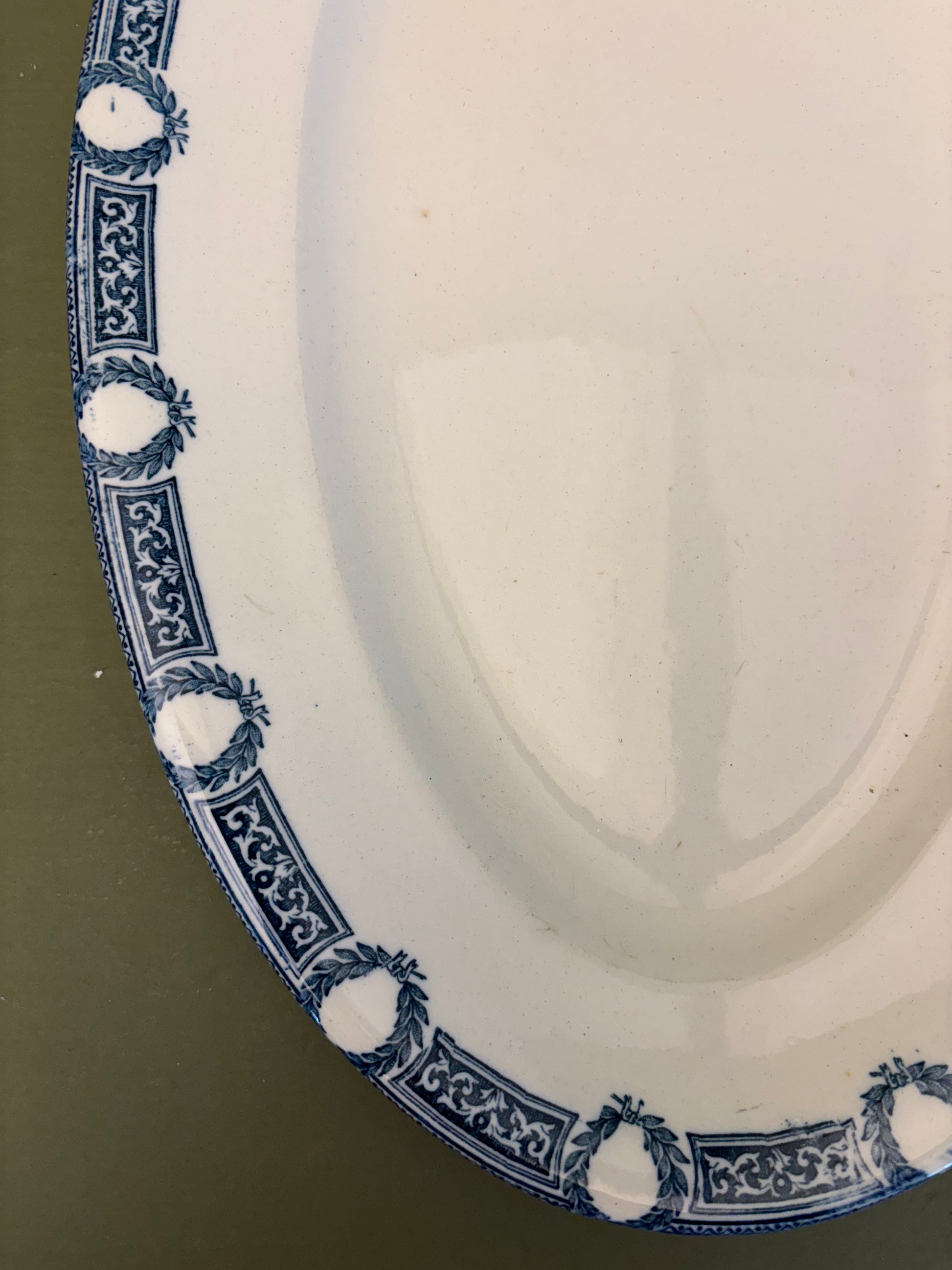 Fint fransk porcelænsfad med blåt mønster i kanten.