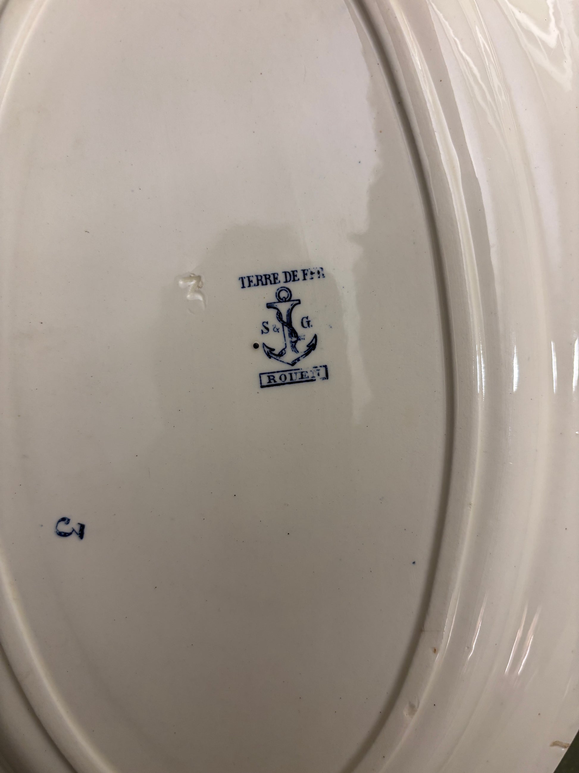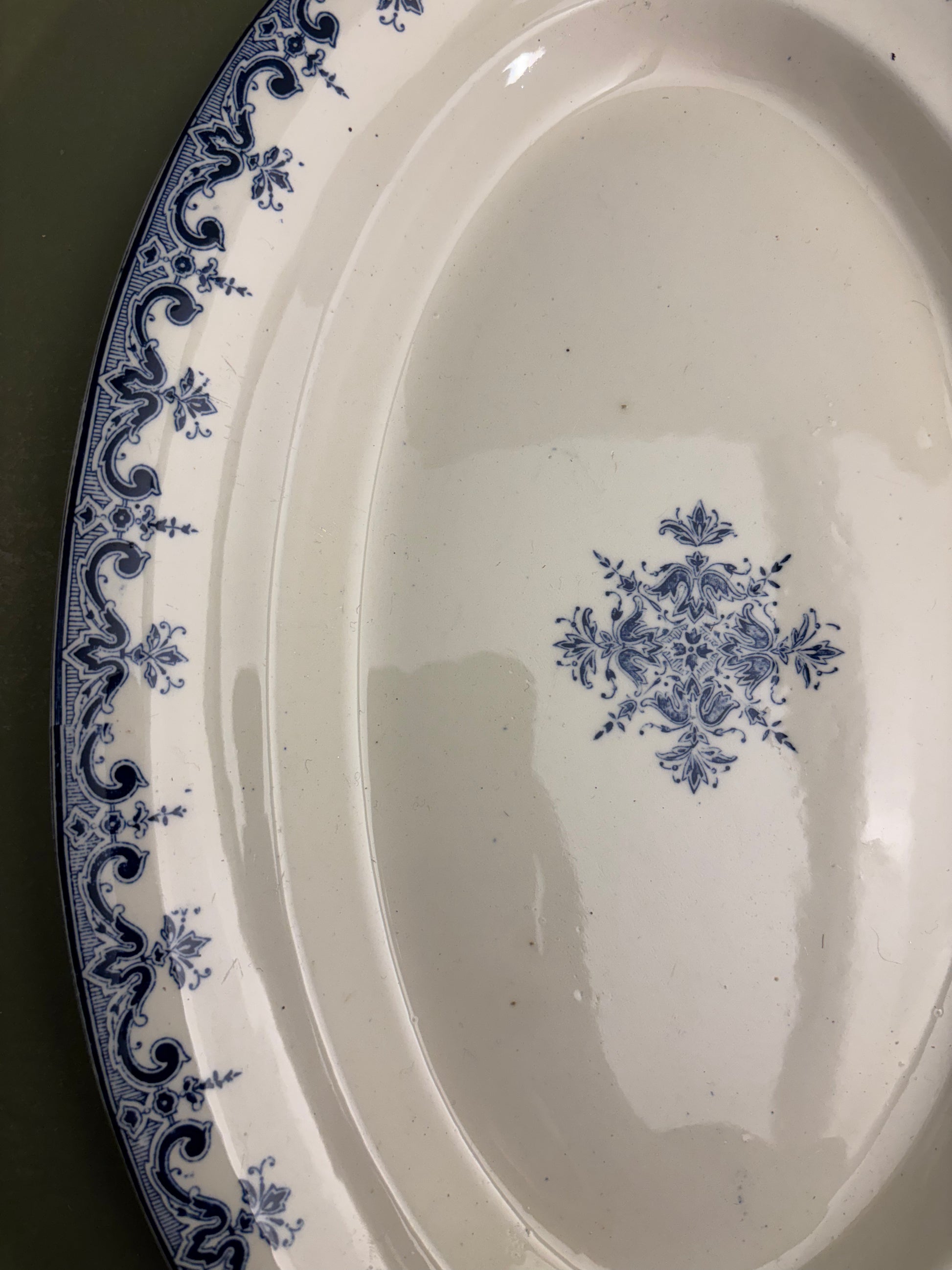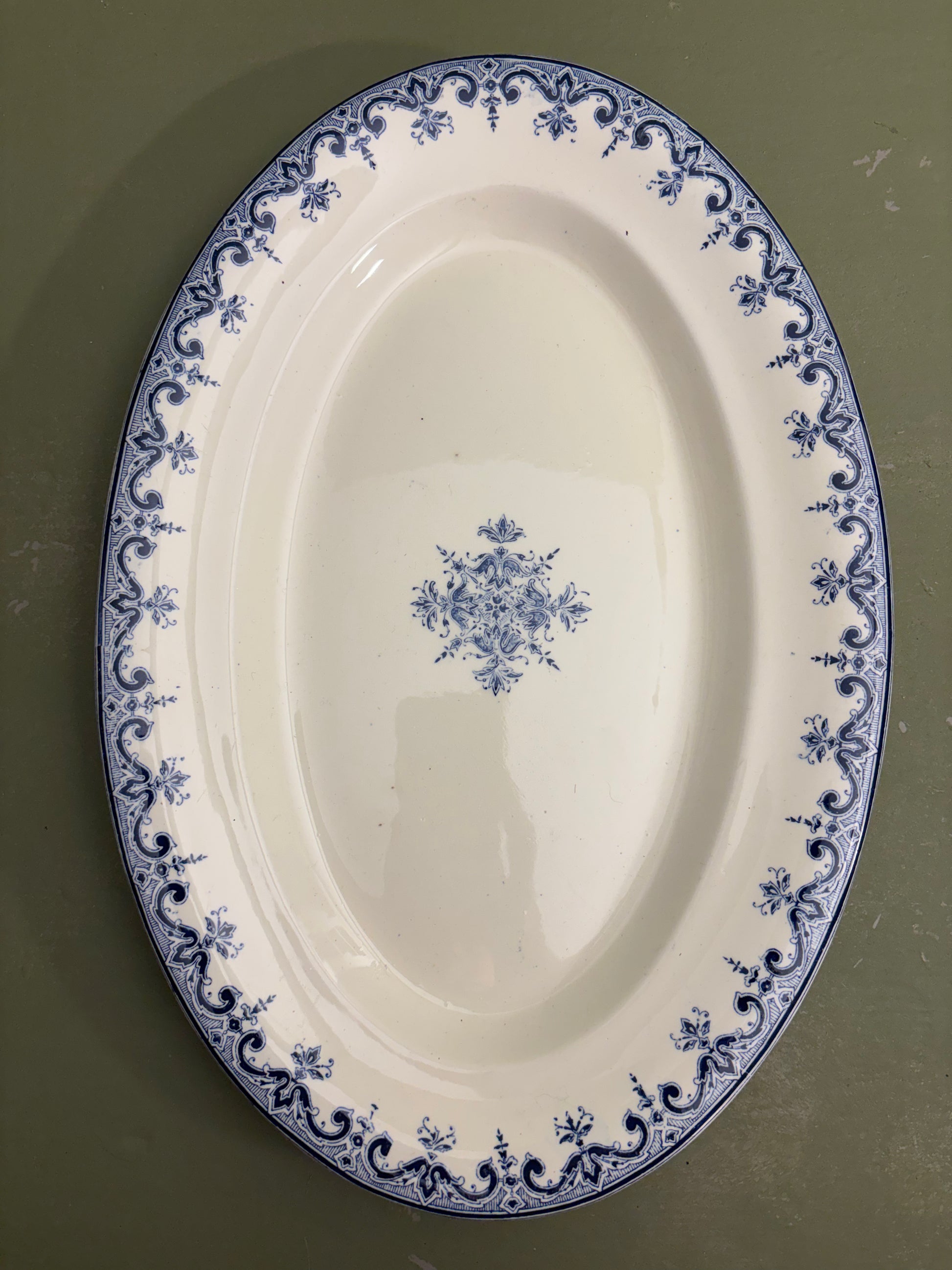 Meget fint fransk fad med fint blåt mønster i midten og langs kanten.