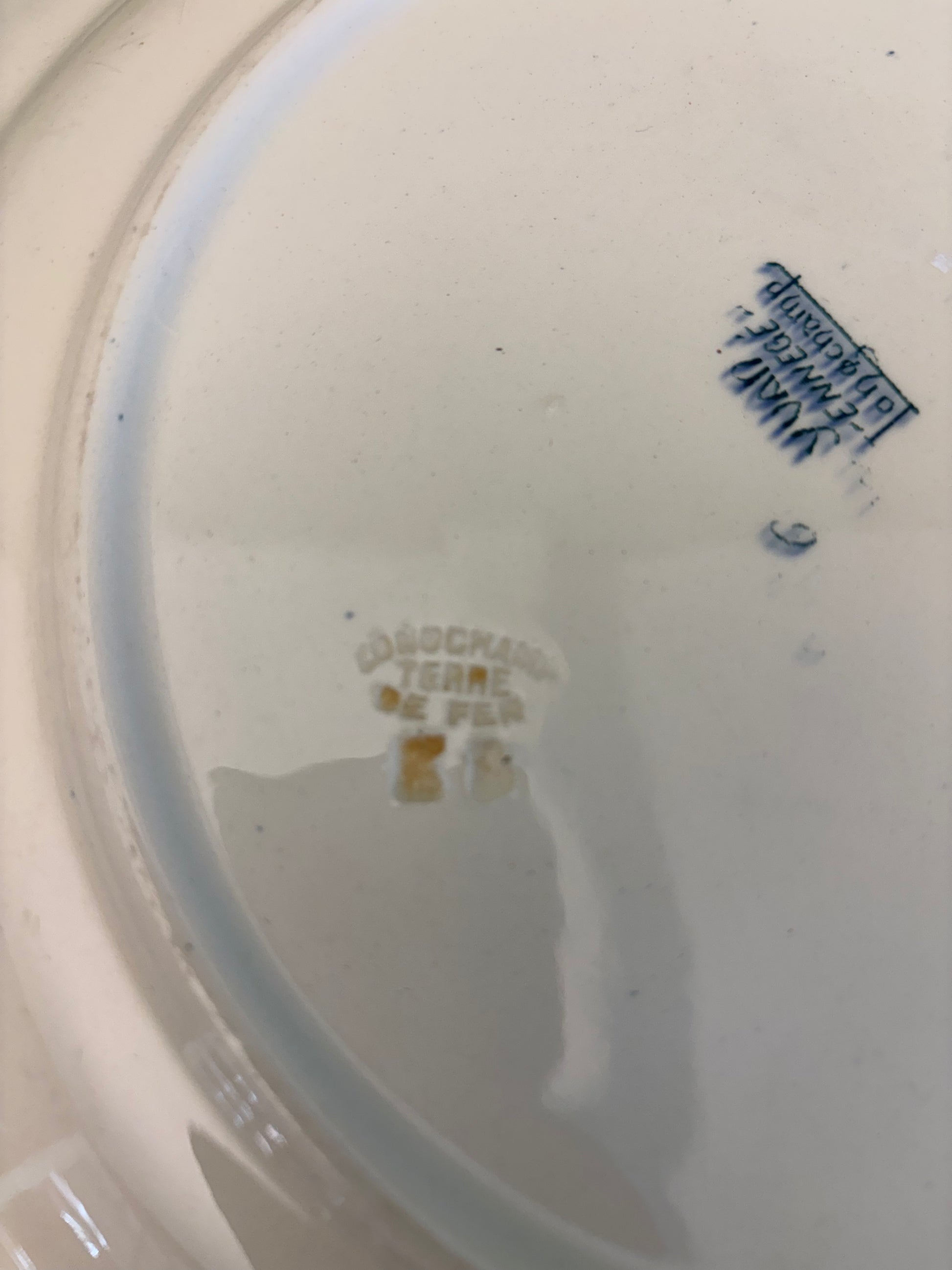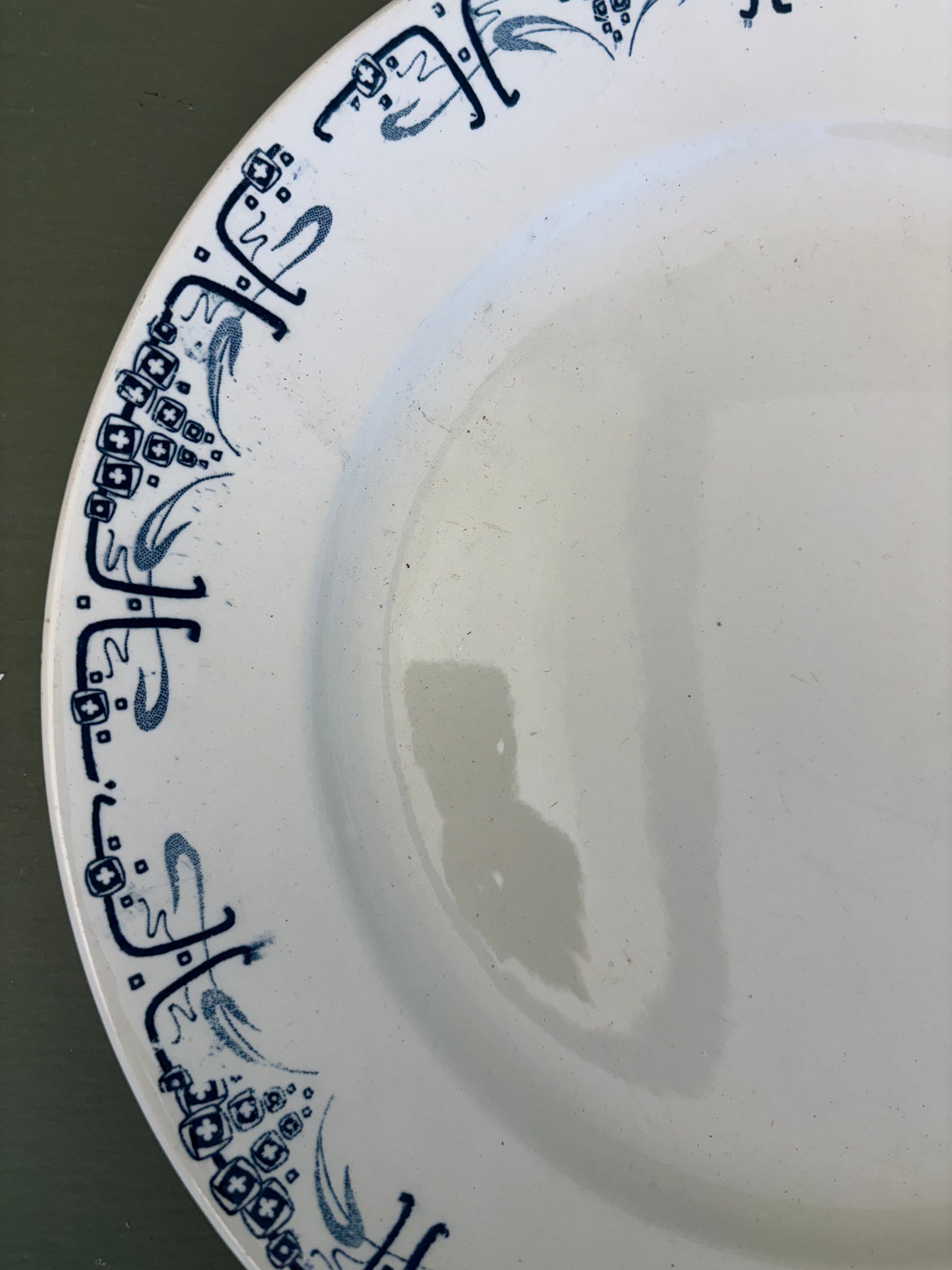 Fransk fad med mørk blå mønster i kanten.