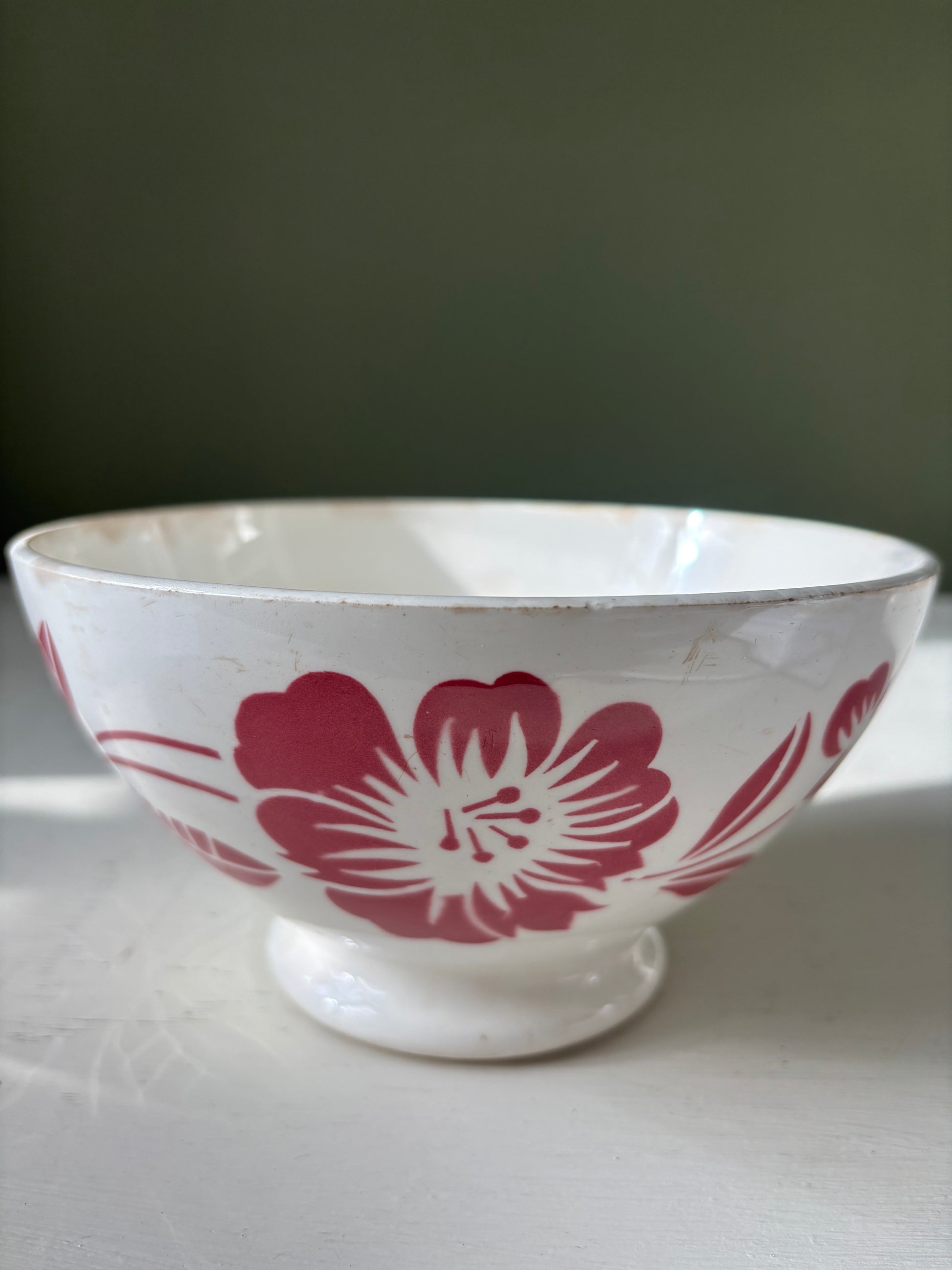 Flot fransk kaffeskål med rødt mønster