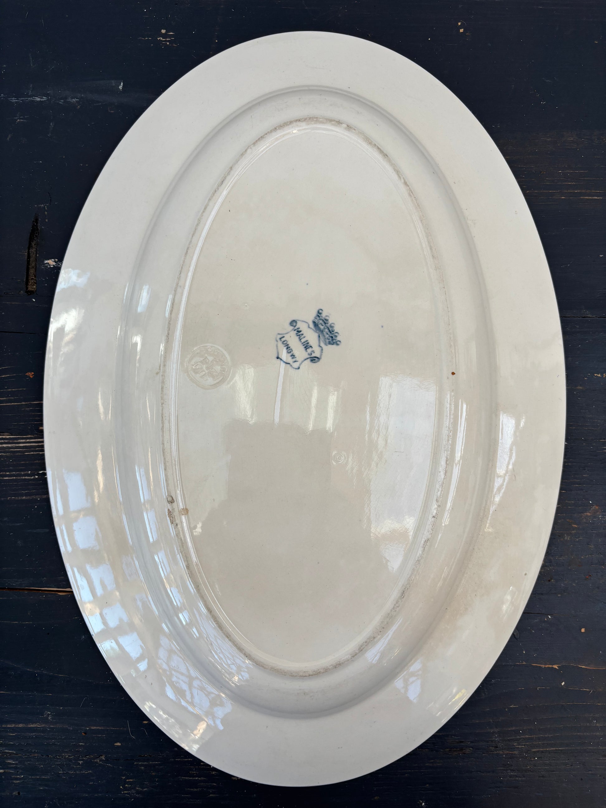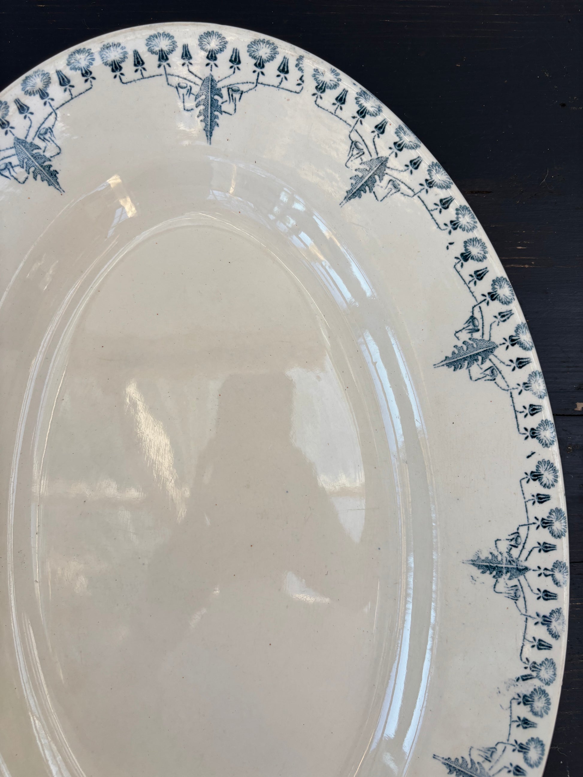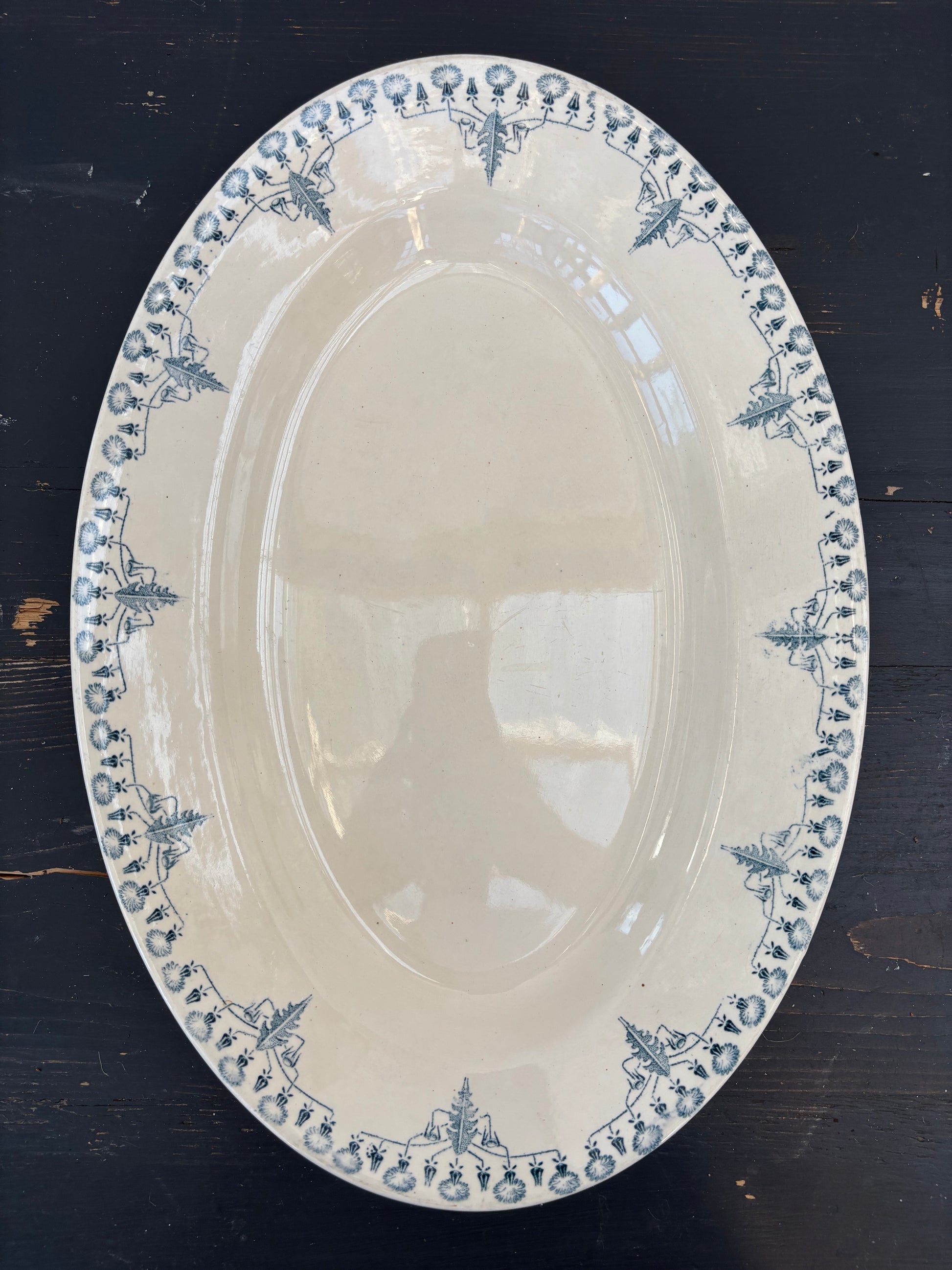 Flot fransk fad med blåt mønster.