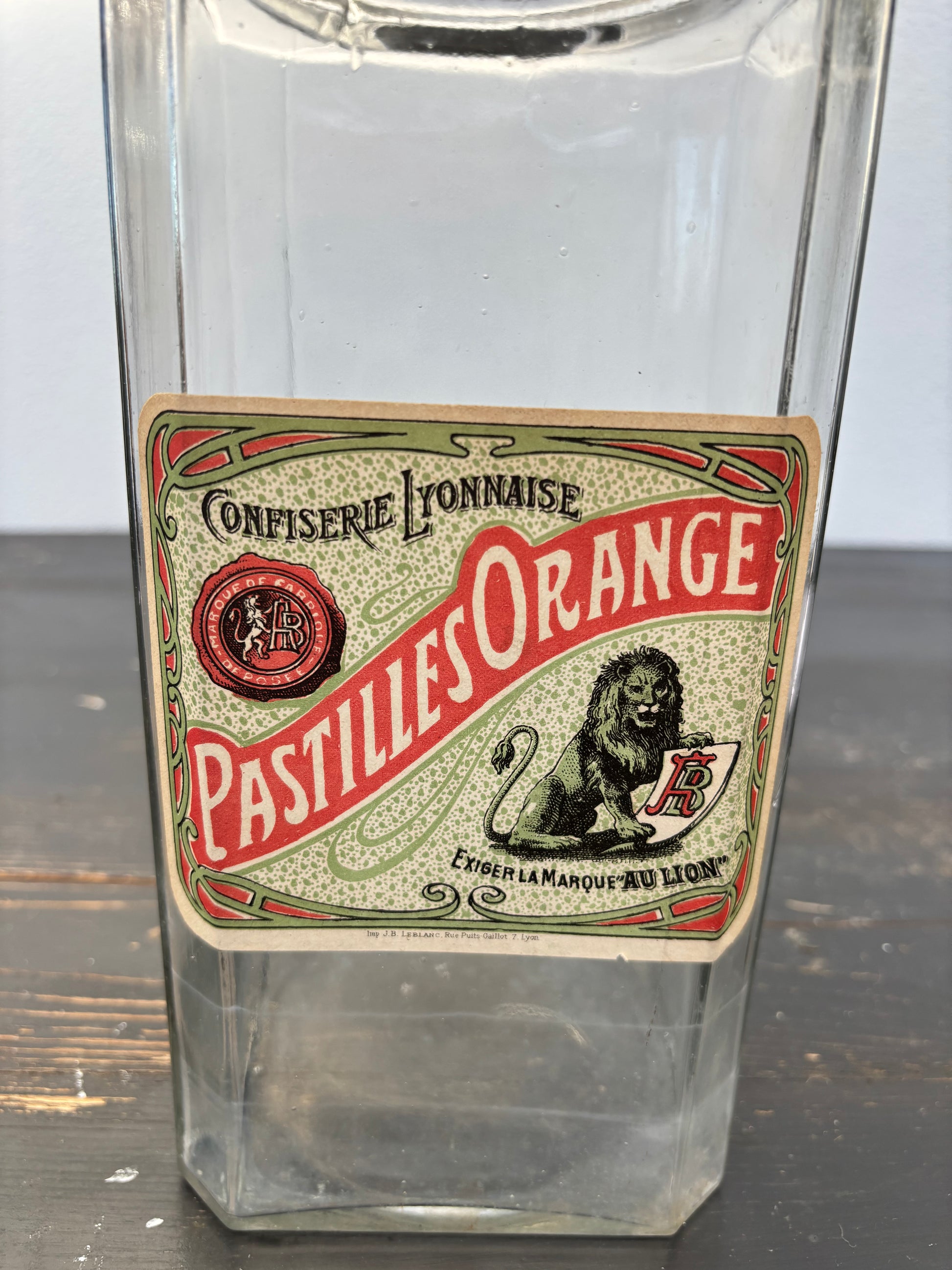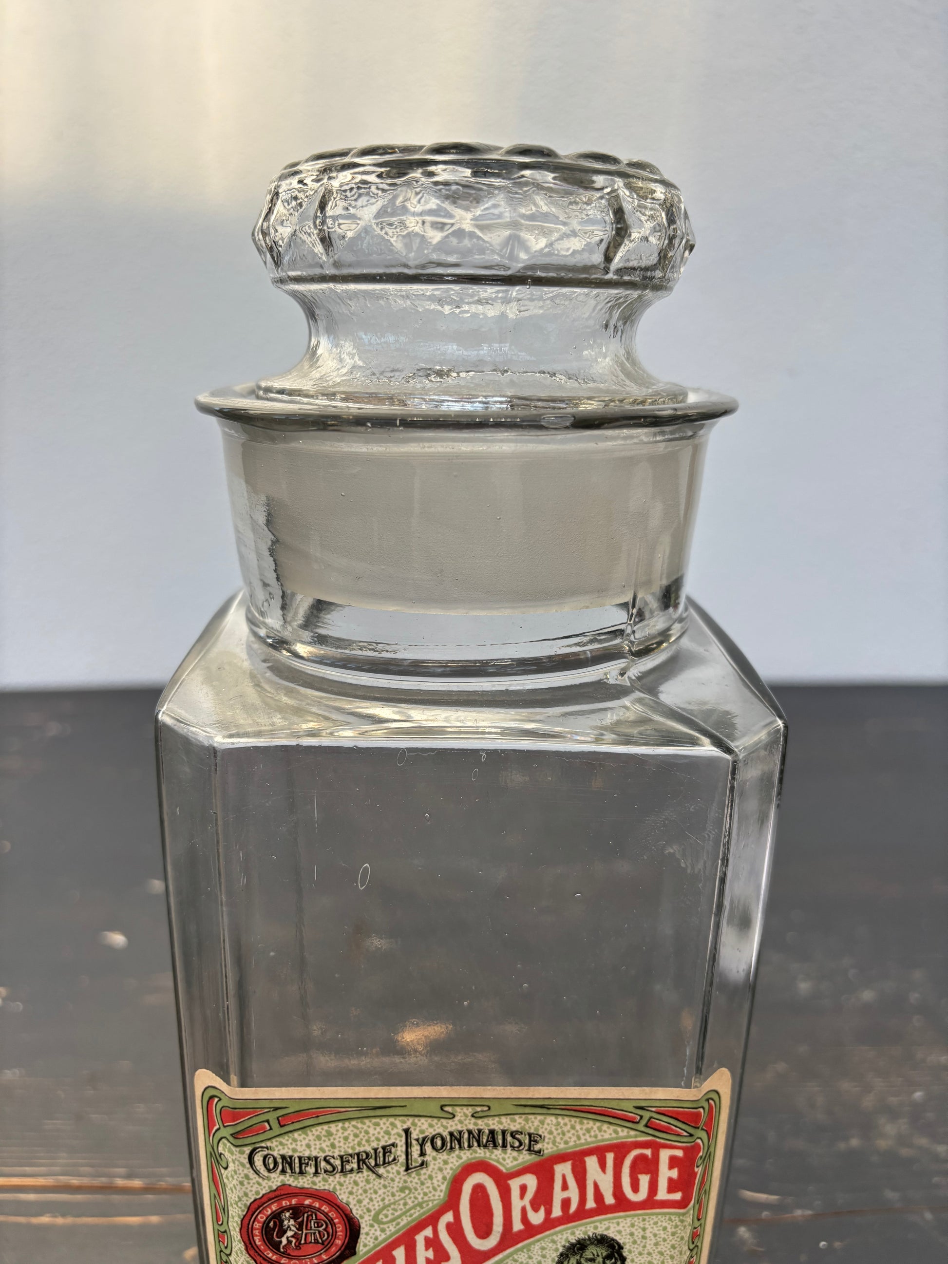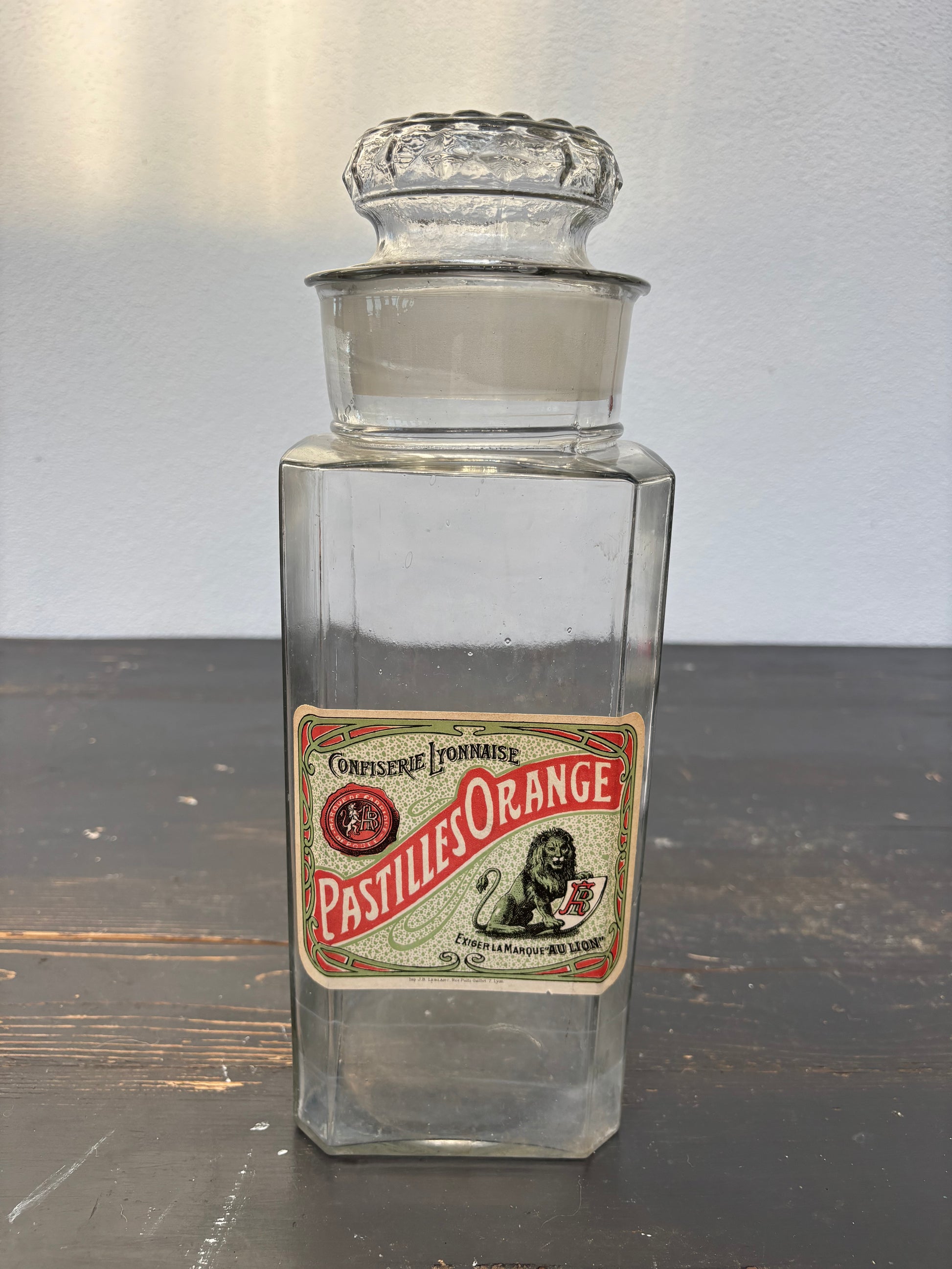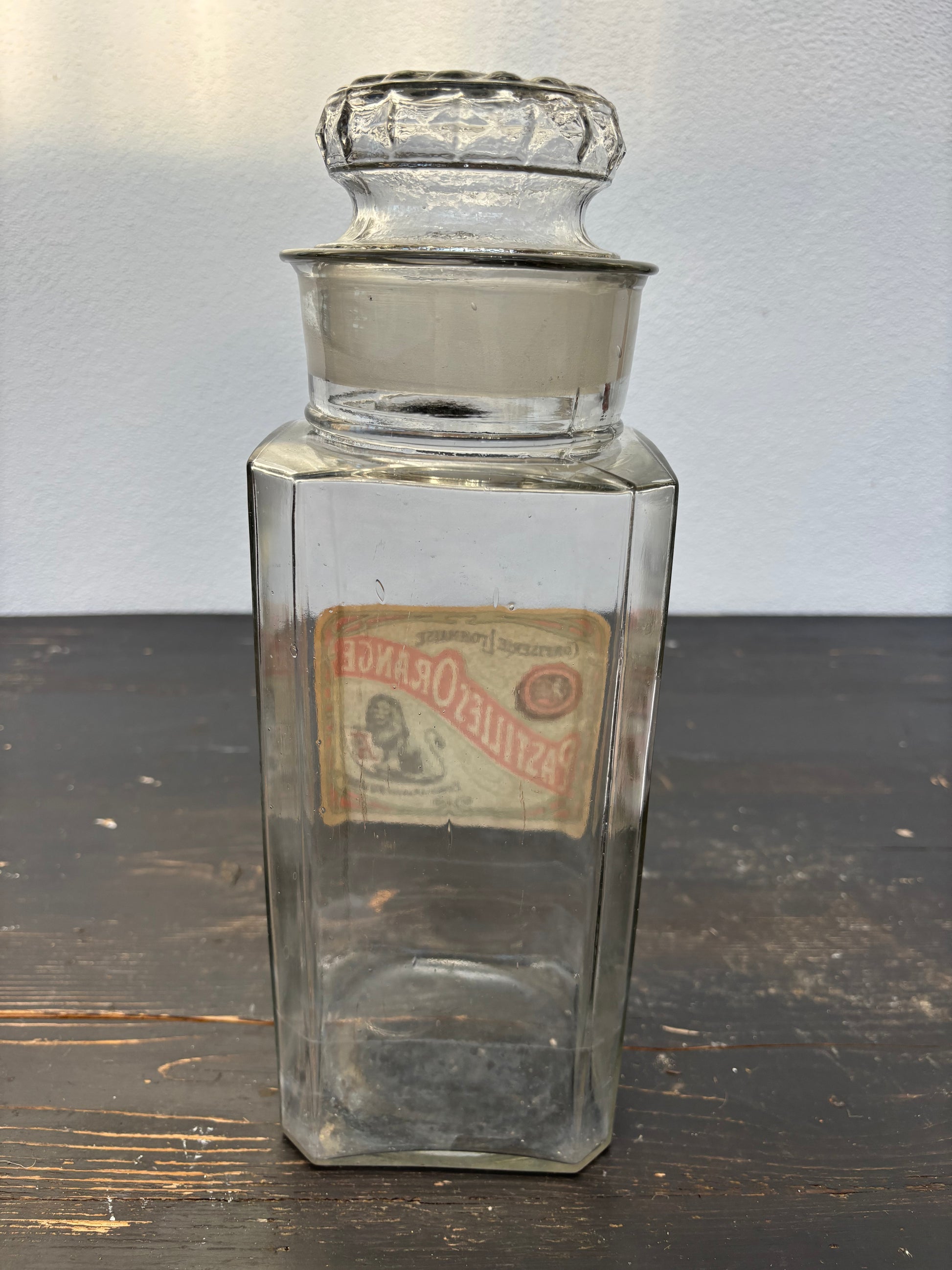 Flot fransk glasbeholder med mærkat.